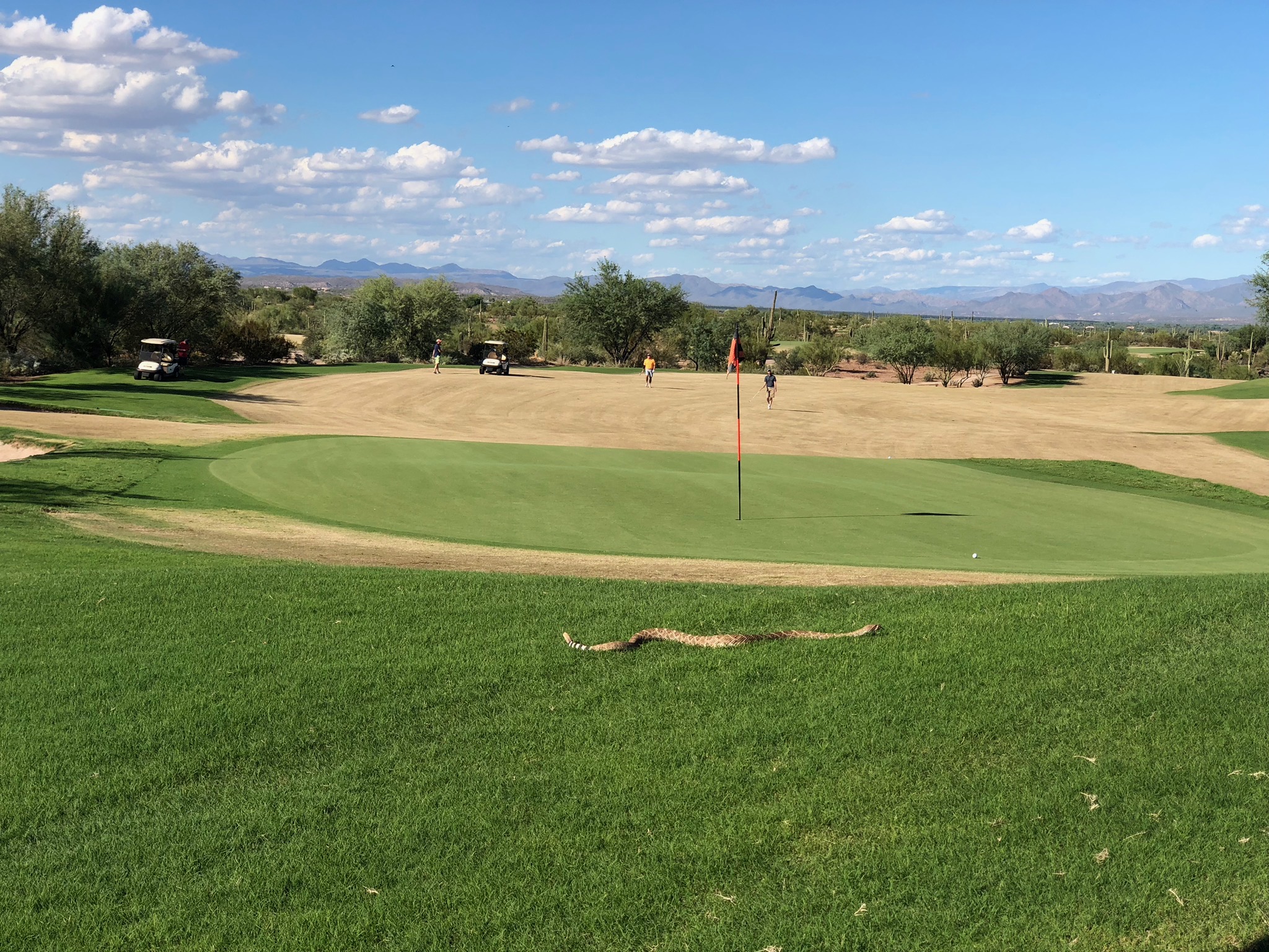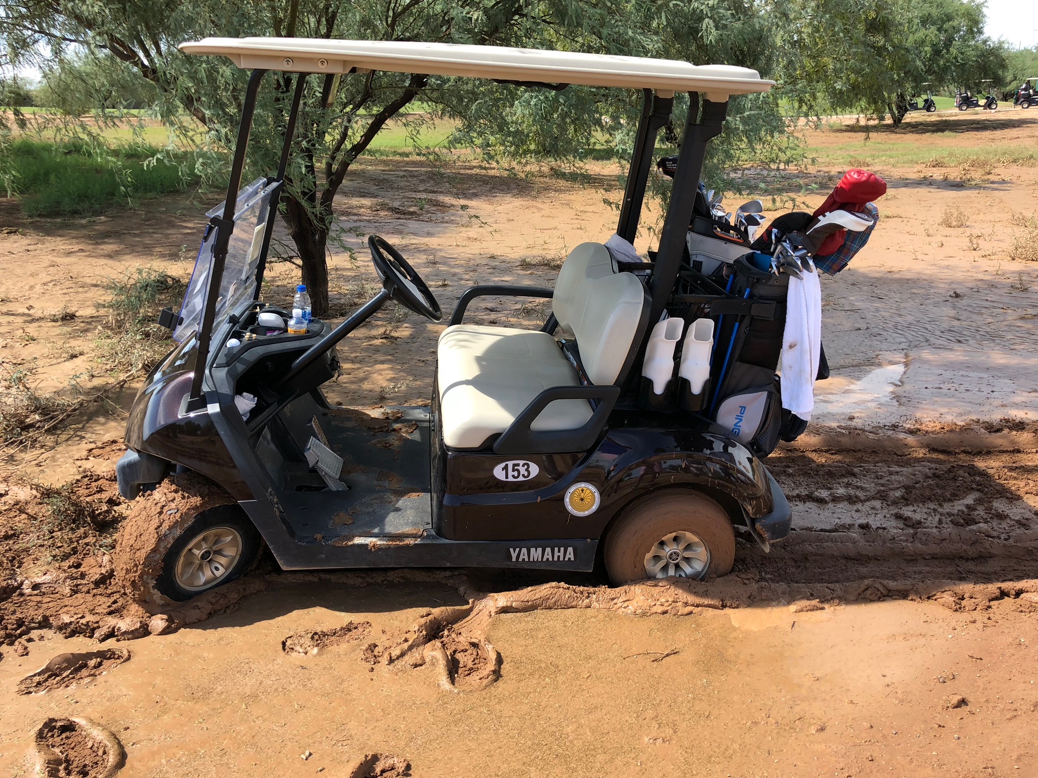 One unexpected adjustment of Talking Stick was the newly created water hazards and standing water caused by heavy rains earlier in the week. These rains also created some interesting adjustments to the cart paths with carts being rerouted all over the course. This led to at least two carts getting stuck in the mud and one that had to be left behind. We can only speculate that the stress of having to leave their cart didn't help the focus of Evan Solomon and Stu Levy.